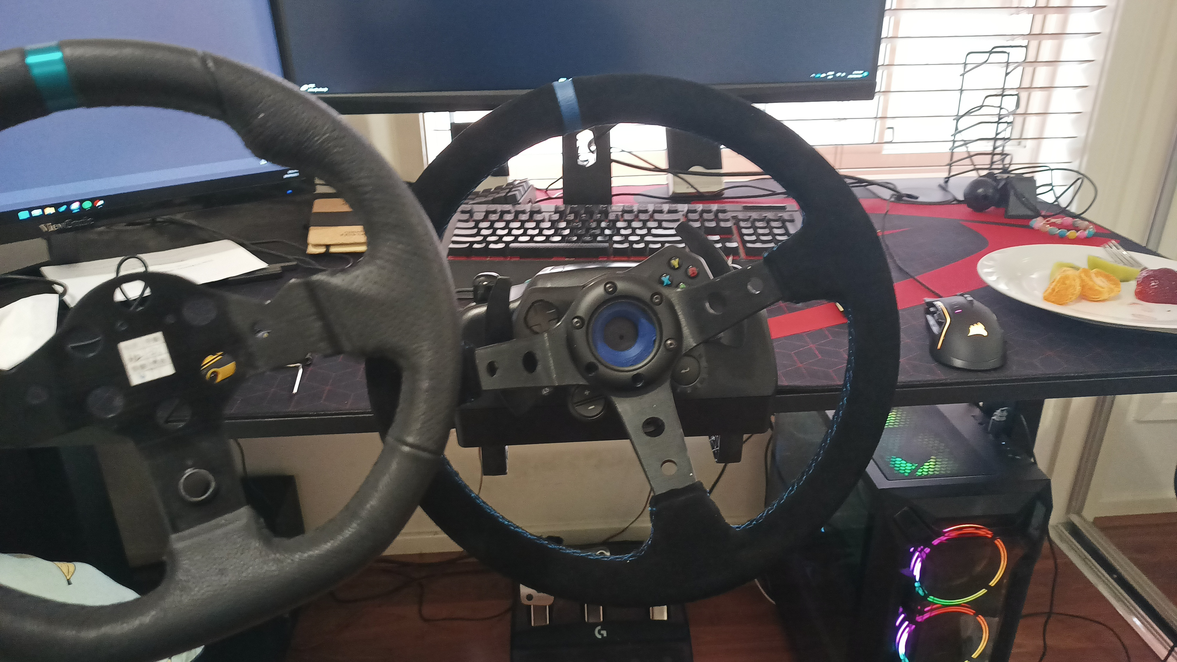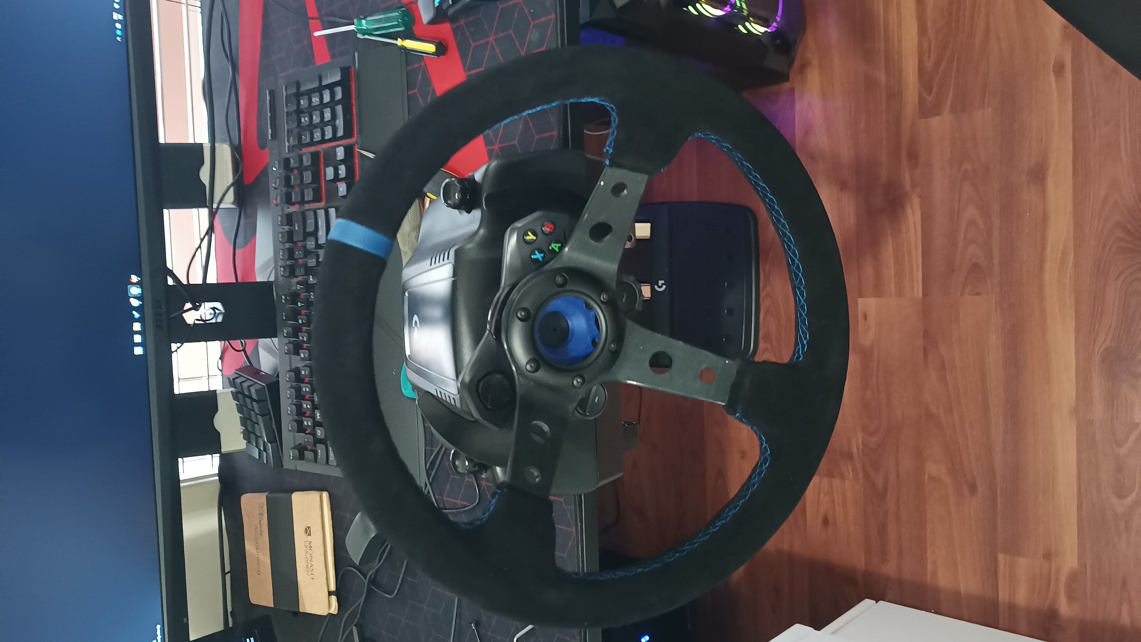 As you can see in the picture above, I did try upgrading the shift knob of the shifter with this interesting long metal knob I found on AliExpress. However, after seeing quite a few Youtubers with deep dish wheels on their G29s, G920s and G923s, I decided to try it for myself. I ordered an Alcantara deep dish with blue accents from AliExpress, and the adapter to fit it on the wheelbase from eBay. Surprisingly, the actual wheel coming from China arrived a few days faster than the adapter which came from another state of Australia. Here’s a pic of the deep dish: